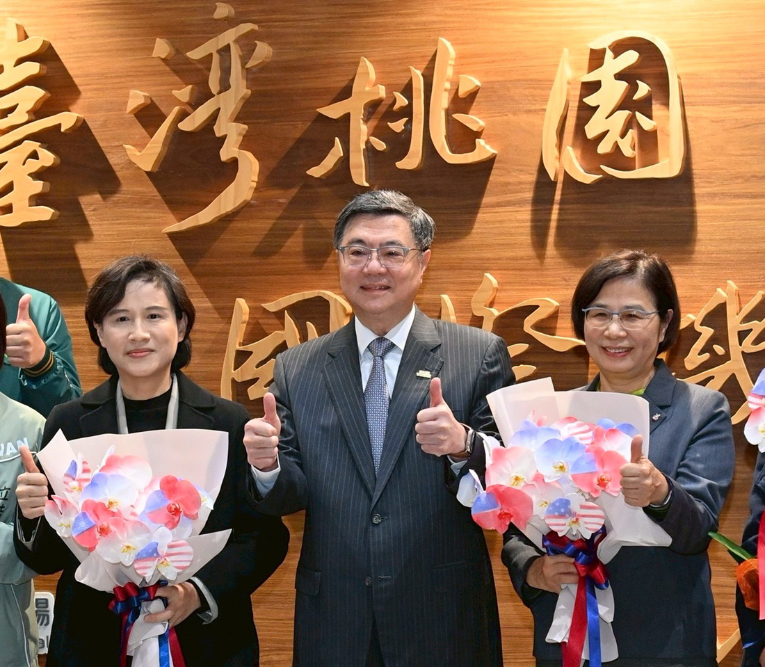 Premier Cho Jung-tai (center) welcomes Vice Premier Cheng Li-chiun (left) and Chief Trade Representative Yang Jen-ni (right) at Taoyuan International Airport, expressing gratitude for their dedication and contributions to Taiwan-U.S. tariff negotiations.