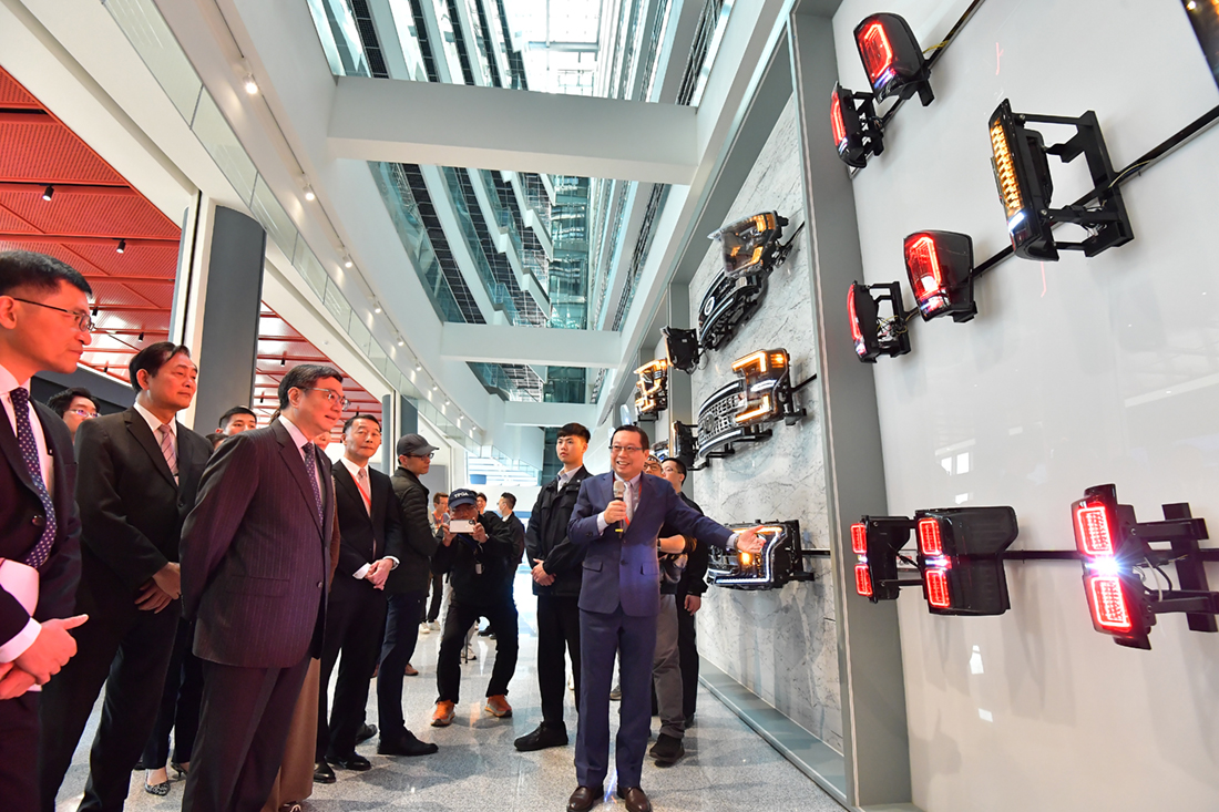 Premier Cho Jung-tai (third left) visits technology and precision engineering businesses in Tainan, affirming the government's role in supporting their steady development.