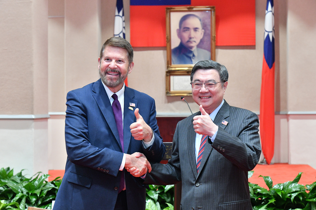 Premier Cho Jung-tai (right) receives a US-Taiwan Business Council delegation led by Chairman Keith Krach, expressing hope for bilateral cooperation on reciprocal tariffs and technology development to forge robust democratic supply chains.